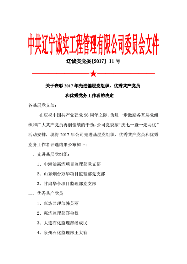 為慶祝中國共產(chǎn)黨建黨96周年,公司黨委于2017年6月30日下午在公司一樓會(huì)議室召開了慶祝建黨96周年暨“一優(yōu)兩先”表彰視頻大會(huì)。公司機(jī)關(guān)、撫順各項(xiàng)目監(jiān)理部及在撫的黨員同志在主會(huì)場(chǎng)參加了大會(huì),中海油惠州項(xiàng)目監(jiān)理部黨支部、甘肅華亭項(xiàng)目監(jiān)理部黨支部、寧夏石化項(xiàng)目監(jiān)理部黨支部、中化泉州項(xiàng)目監(jiān)理部黨支部、廣西石化項(xiàng)目監(jiān)理部黨支部、蘭州石化項(xiàng)目監(jiān)理部黨支部、內(nèi)蒙古君正項(xiàng)目監(jiān)理部黨支部、神華寧煤項(xiàng)目監(jiān)理部黨支部、煙臺(tái)萬華項(xiàng)目監(jiān)理部黨支部設(shè)立視頻分會(huì)場(chǎng)。黨委委員馬駿主持了視頻大會(huì)。首先,公司黨委副書記馮玉琢同志宣讀了“一優(yōu)兩先”表彰決定。接著,黨委書記孫學(xué)良結(jié)合公司實(shí)際做了慶祝建黨96周年的講話。最后全體黨員重溫的入黨誓詞,進(jìn)行入黨宣誓。