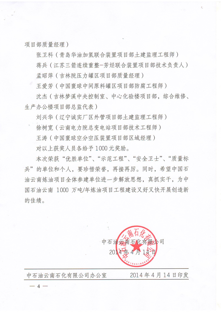 我公司榮獲中國石油云南1000萬噸/年煉油項(xiàng)目2014年3月份“優(yōu)勝單位”榮譽(yù)稱號(hào)!