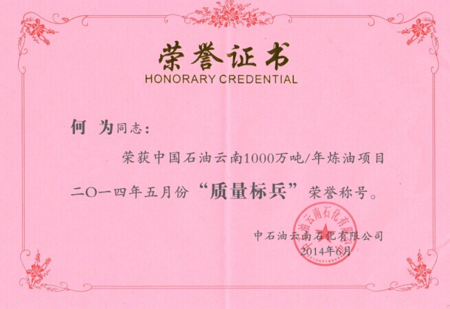 表彰:云南項目部何為同志榮獲中國石油云南1000萬噸/年煉油項目2014年5月份“質(zhì)量標兵“榮譽稱號