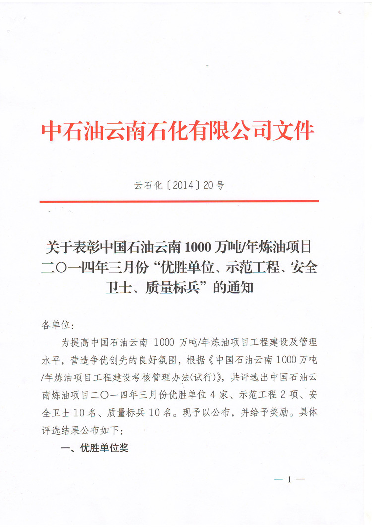 我公司榮獲中國石油云南1000萬噸/年煉油項(xiàng)目2014年3月份“優(yōu)勝單位”稱號(hào)