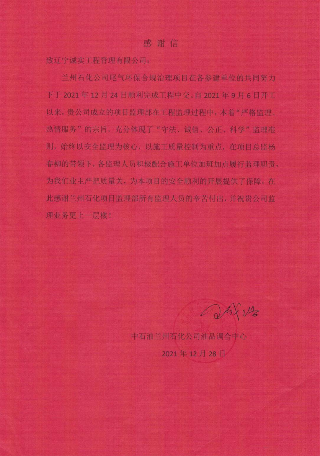 12月28日,蘭州項(xiàng)目監(jiān)理部收到中石油蘭州石化公司油品調(diào)合中心發(fā)來(lái)的感謝信。信中,業(yè)主單位對(duì)項(xiàng)目部全體監(jiān)理人員在項(xiàng)目開展過(guò)程中的工作表現(xiàn)給予了充分的肯定和高度的贊譽(yù)。這是對(duì)我公司卓越的項(xiàng)目管理水平和強(qiáng)大的人才隊(duì)伍的最好見證,同時(shí)也完美的展現(xiàn)了我們一貫以來(lái)“敢打硬仗、善打難仗、能打勝仗”的優(yōu)良傳統(tǒng)和作風(fēng)。希望各項(xiàng)目部要以此為動(dòng)力,不忘初心,牢記使命,擔(dān)當(dāng)作為,為樹立誠(chéng)實(shí)品牌、打造誠(chéng)實(shí)形象再立新功!