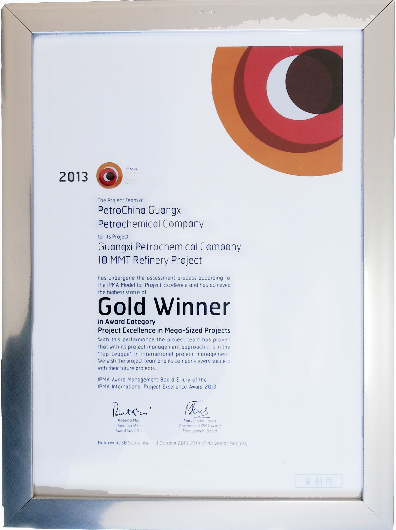 我公司承接了中國(guó)石油廣西石化千萬(wàn)噸煉油項(xiàng)目,該項(xiàng)目榮獲IPMA國(guó)際卓越項(xiàng)目管理金獎(jiǎng)